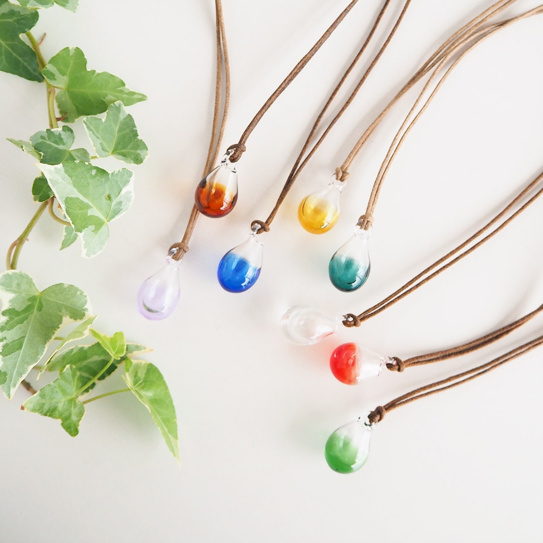 上部の穴にお好みのエッセンシャルオイルや香水を数滴垂らして身につけると、体温でガラスが温まり、ほのかに香ります。