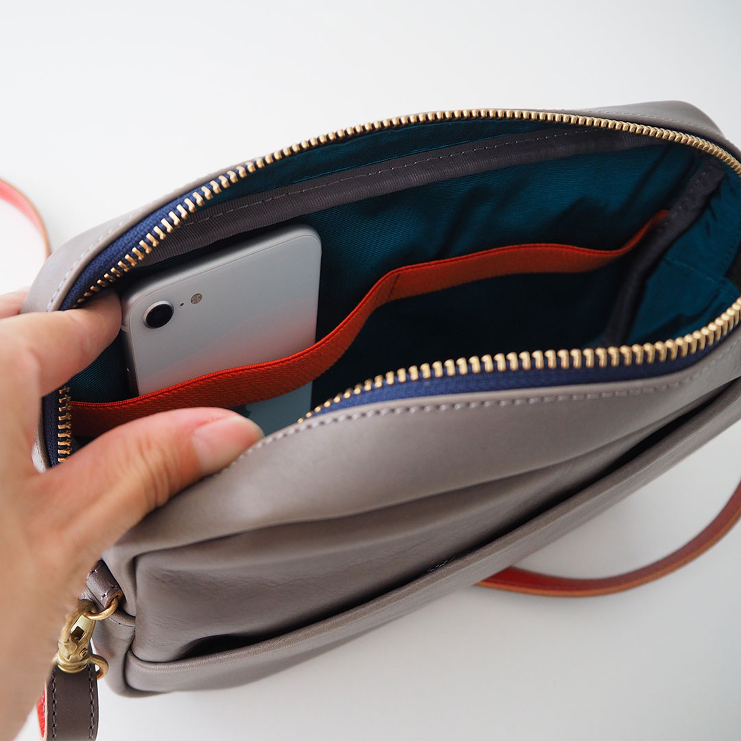 長財布、ポーチ、スマホ、小さめの水筒など、お出かけに必要な荷物がしっかり入りますが、角を落として大きさを感じさせないシルエットに仕上げています。