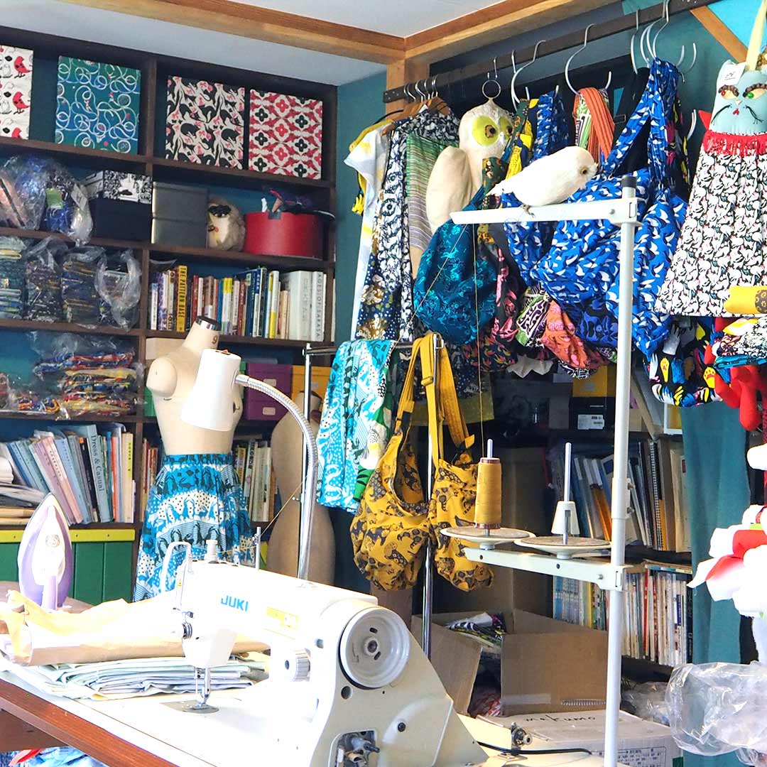 アトリエの一角。色とりどりの布たちが一斉に目に飛び込んできます。