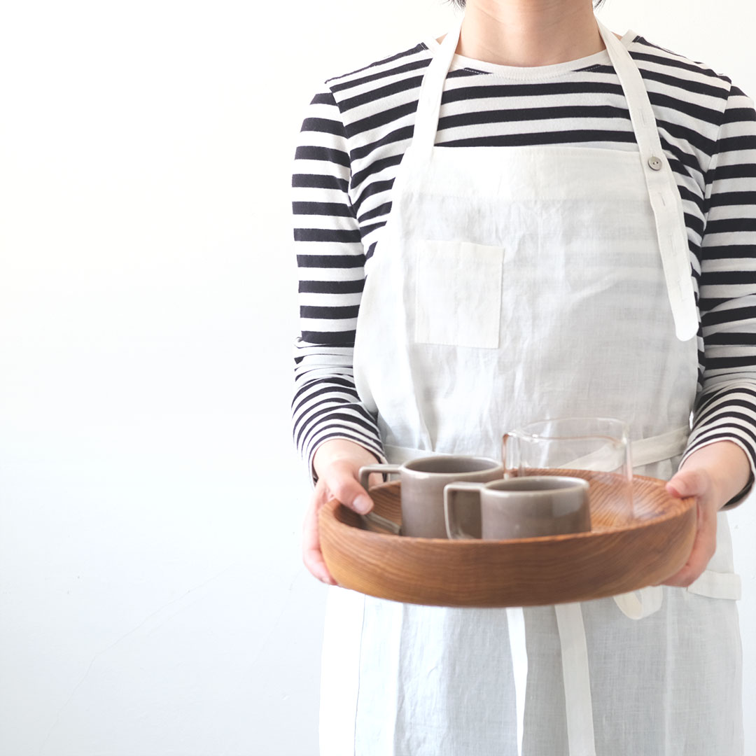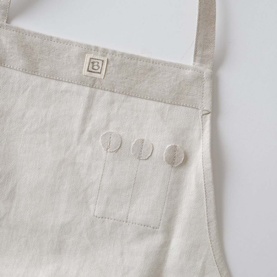 【 働く人の機能的なエプロン 】 料理だけでなくさまざまなシーンで使って欲しいと考えてデザインされたエプロンです。 庭仕事、大工仕事、絵を描いたり、お店の制服として使うならどんな機能が必要か・・・ 体型、性別にこだわらず快適に着られるようにするにはどうしたらいいのか・・・ 機能的かつ快適に使えるようにと考えたどり着いた形です。 家の中でも仕事場でも、きっといい相棒になってくれるでしょう。 右胸にはペンをさせる縦長のポケットが2つ、右前にはスマホやメモ帳が入る大きなフラップ付きポケット、反対側はタオルループがつけられています。 厚手の綿麻キャンバス生地を使用しています。 ハードな作業にも耐える丈夫な生地です。
