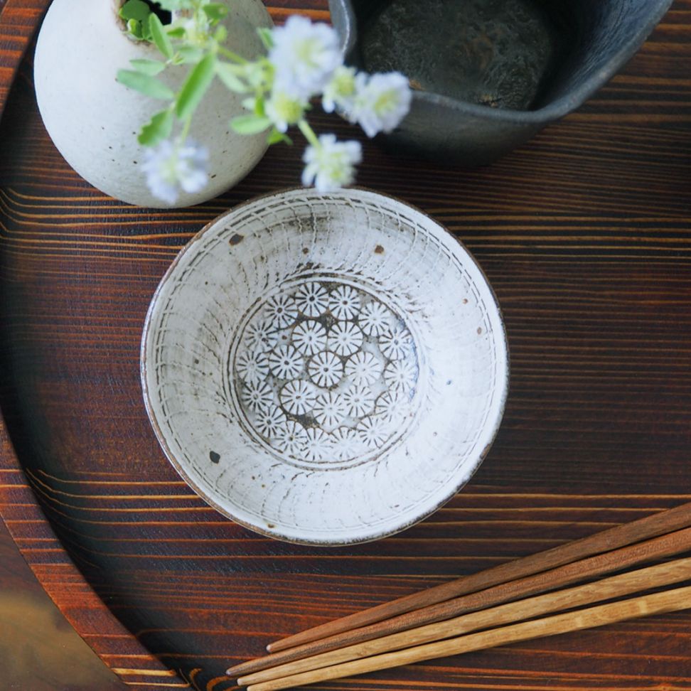 繊細な紋様と釉薬の濃淡が美しく、ざっくりとした土味の素朴さと力強さも感じられます。
