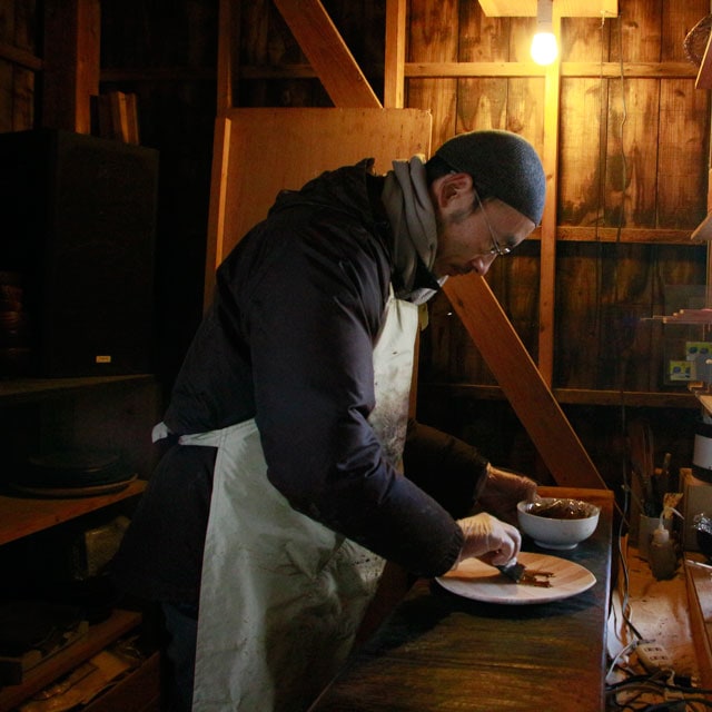やわらかな杉の木肌に漆をたっぷりと染み込ませていきます。