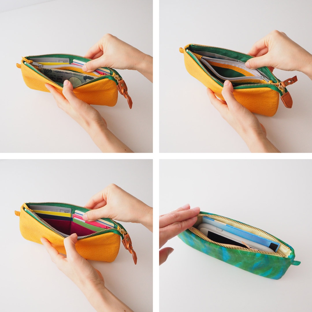 お札などを入れるスペースは2カ所、中央のファスナーポケットには小銭を、カードは6枚収納可能です。通帳やスマホも入れられる大きさです。