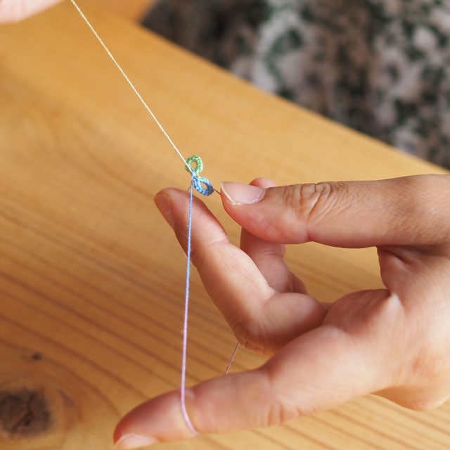 タティングレースとは、細いレース糸とちいさな舟形の「シャトル」という糸巻きを使って、小さな結び目を連続して作ることで模様を仕上げていく技法です。
