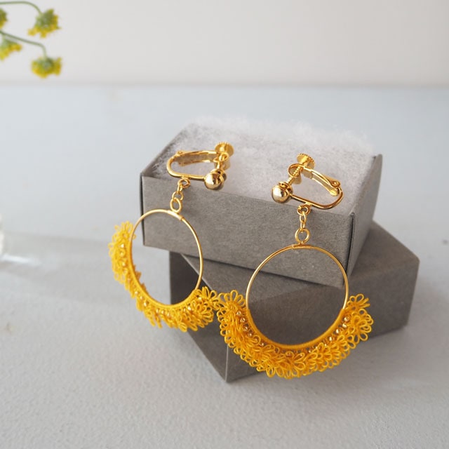 繊細な手仕事で編まれたお花が、可憐な表情を見せるタティングレースのピアスです。