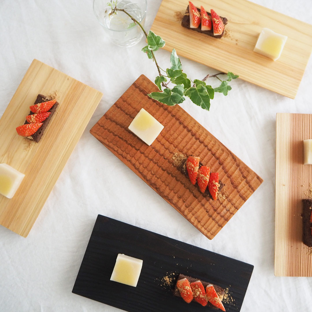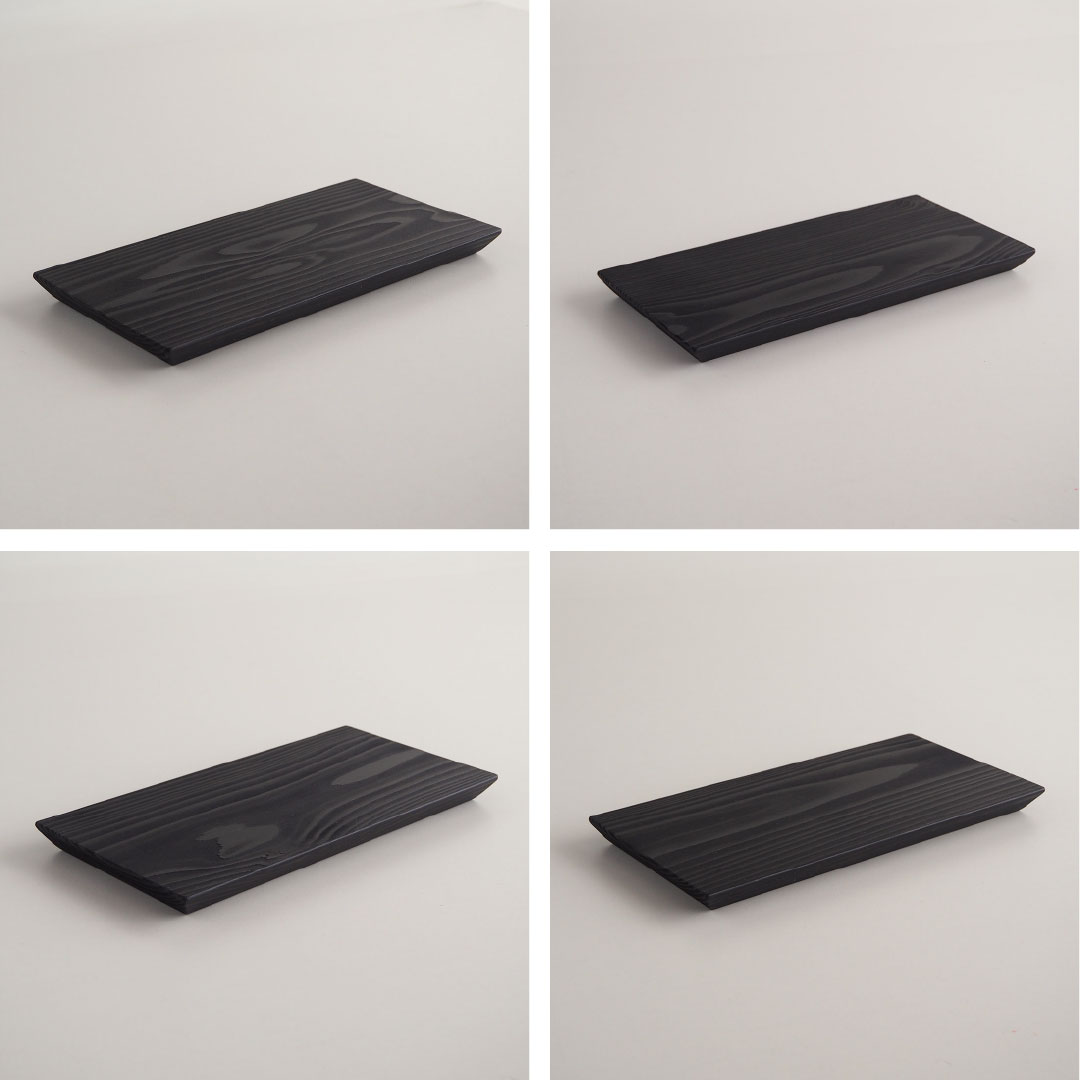 つや消しの墨黒が印象的な糸島杉の板皿です。