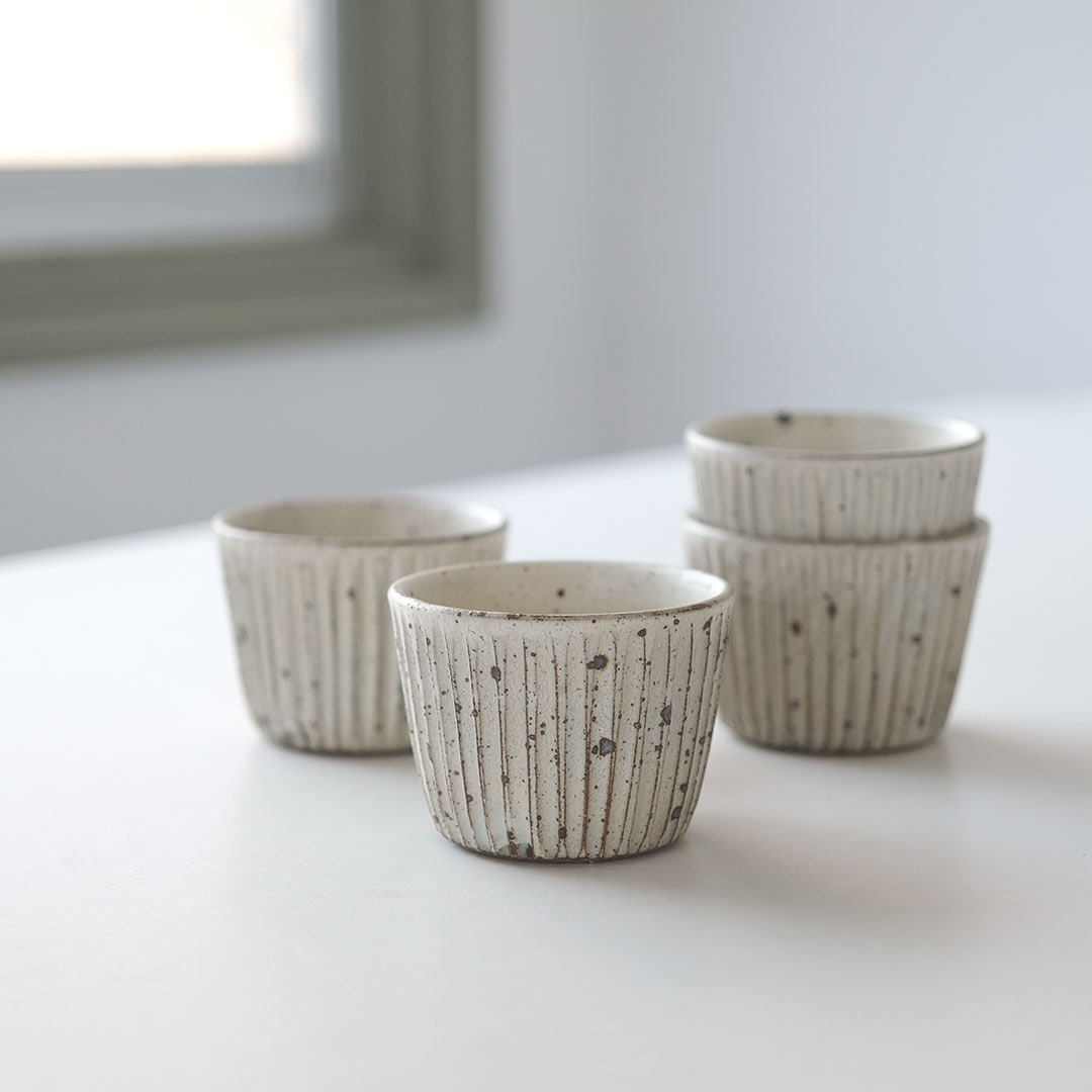 やわらかな白い釉薬から噴き出した黒点が素朴でありながらも力強さのある雅樂窯(うたがま)さんの粉引。