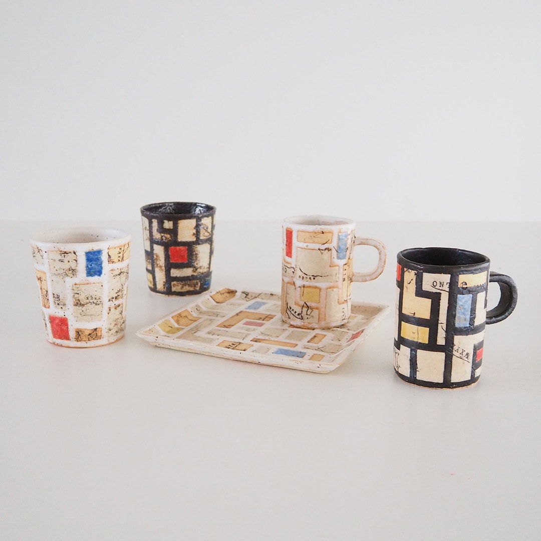 アルファベットの型押しやランダムに描かれた線、釉薬の質感の違いなど一つのカップの中にも様々な表情があります。