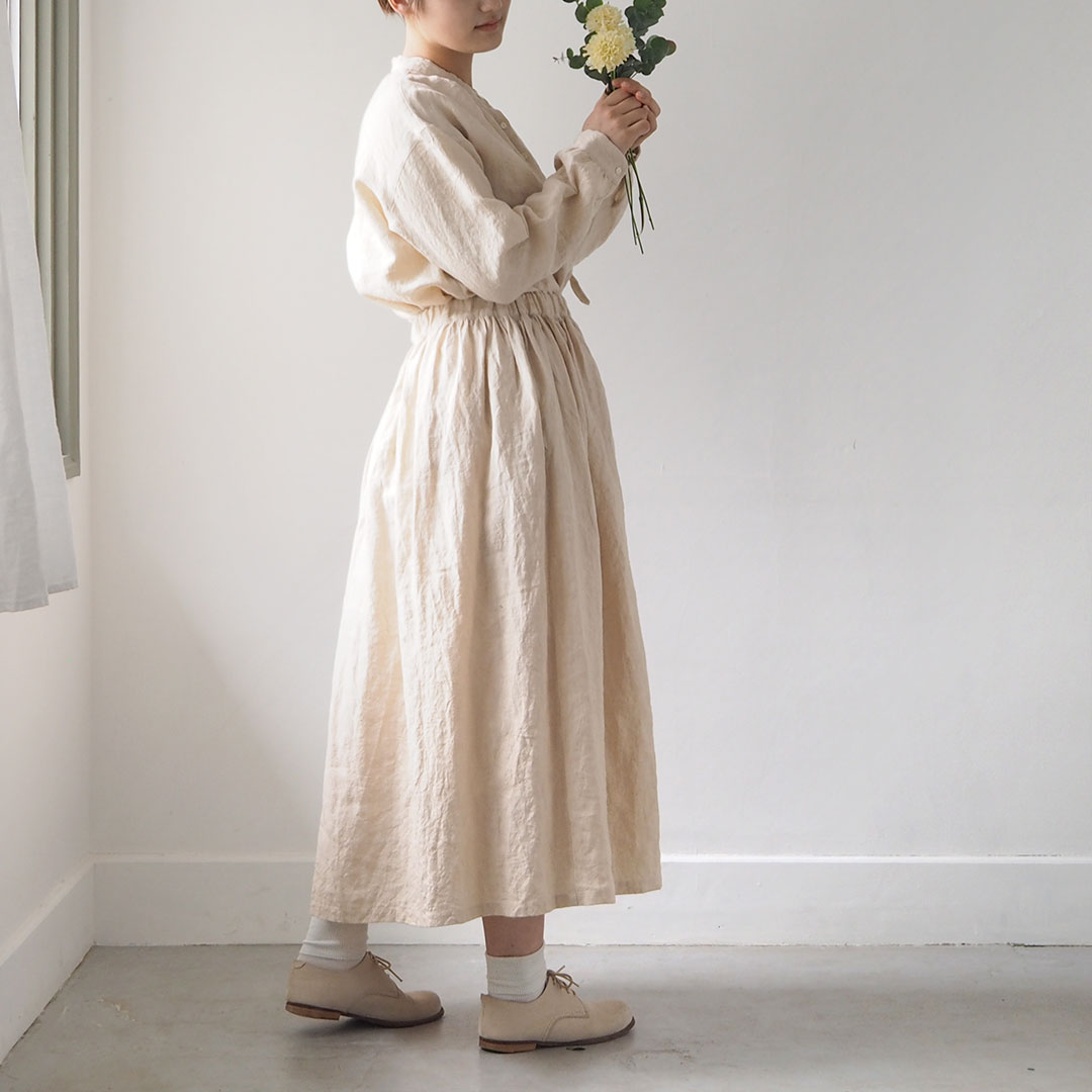 着るほど洗うほどにだんだん柔らかく肌になじむリネンは、スカートやパンツ、肌寒い時期にはニットと合わせて、普段着としても長く着ていただけます。