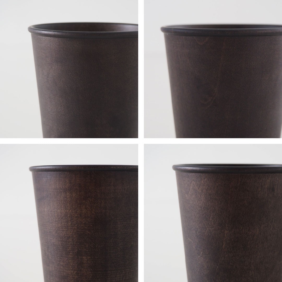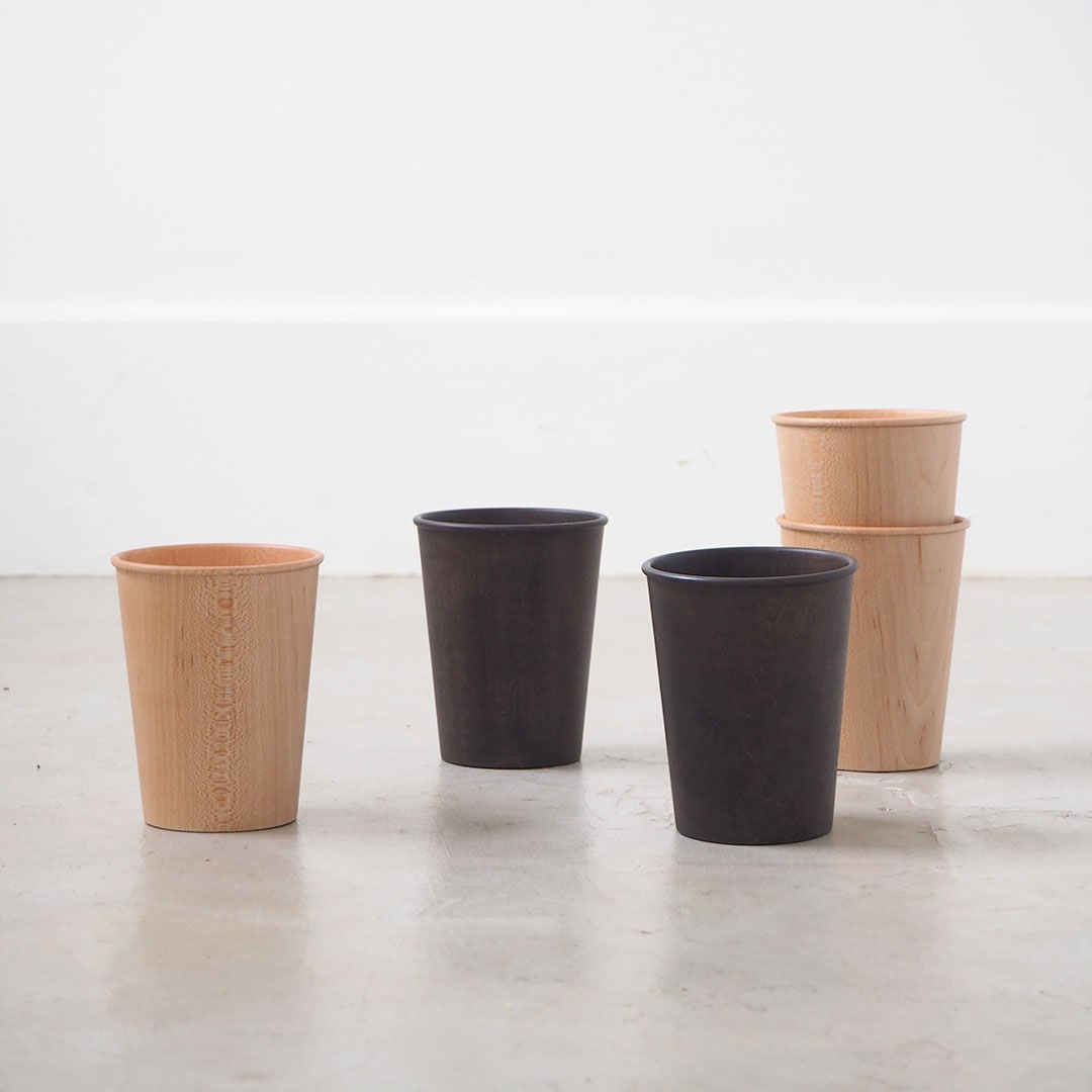 【 紙コップみたいな木のコップ 】 誰もが使ったことのあるあの紙コップが、DDFさんの手によりスタイリッシュな木のコップになりました。 縁のふくらみもしっかり再現されており、唇に心地よい感触です。 正確に滑らかに削り出されたサラサラの手触りは手仕事とは思えないほど。 木ならではの軽さと扱いやすさがあり、家だけでなくアウトドアでも重宝しそうなカップです。 【 木の表情を感じる黒 】 独特な黒い色は、木酢酸鉄液と柿渋による鉄媒染という技法で染められています。 うっすらと木目が残る、この技法ならではの味わい深さをお楽しみください。 楓や水目の明るく色白の木肌が柔らかな雰囲気のナチュラルもあります。