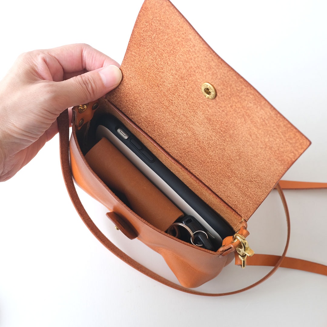 スマホ、鍵、小さめの財布程度の荷物が入り、内ポケットもあるので、そちらに免許証などのカード類を入れることができます。