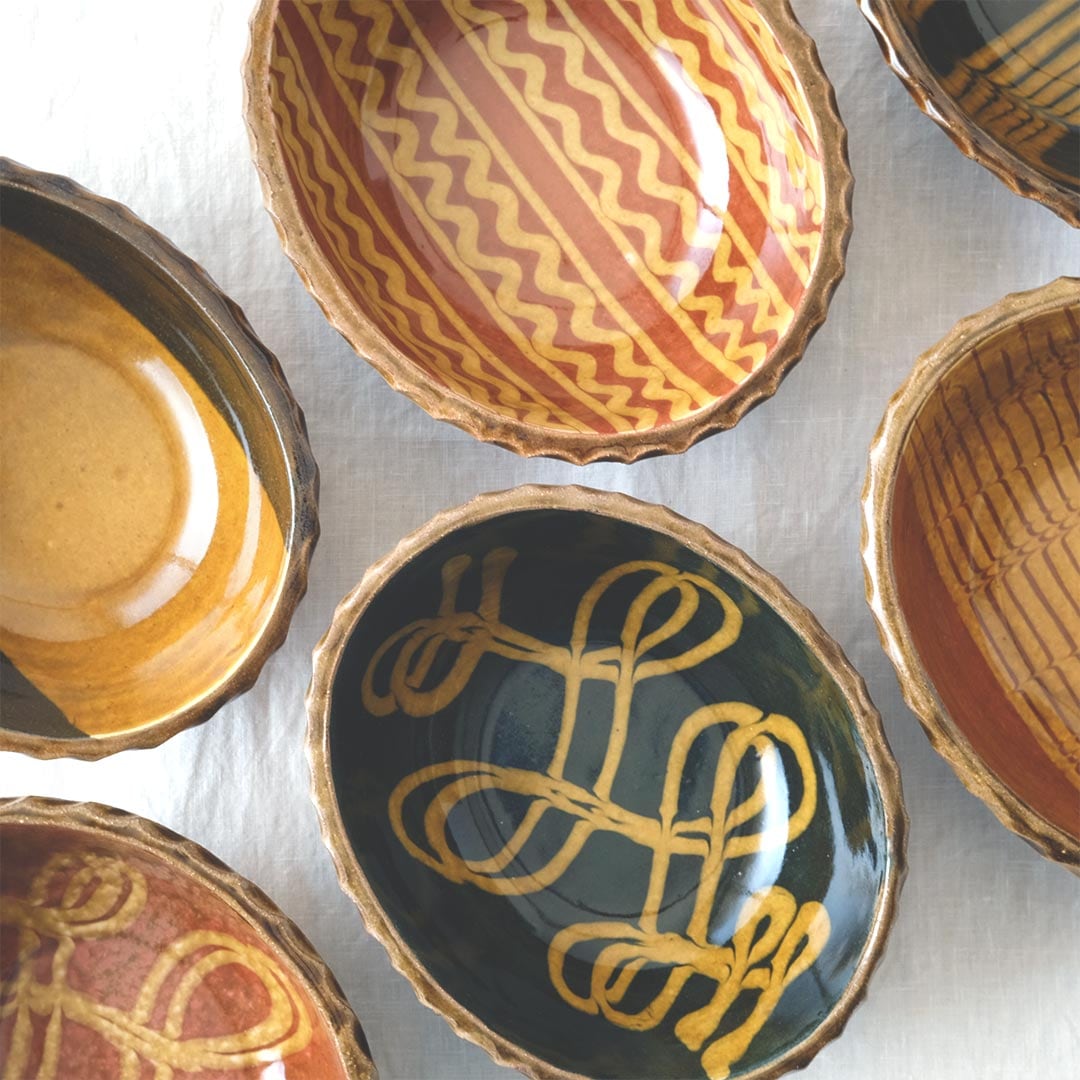 スリップウェアは、模様を描いてから成形するという特殊な方法で作られており、カーブにも模様が崩れずに入っているのが特徴です。