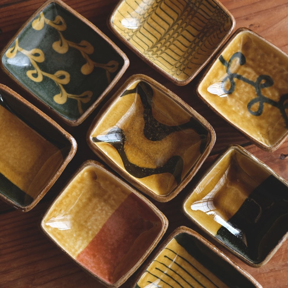 スリップウェアは、模様を描いてから成形するという特殊な方法で作られており、カーブにも模様が崩れずに入っているのが特徴です。