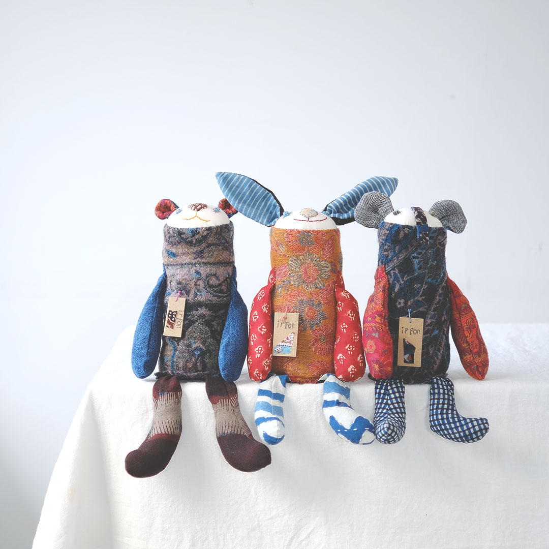 いろいろな素材や柄、色の組み合わせで作るipponさんの作品は、人柄そのままのおおらかで楽しいものばかりです。